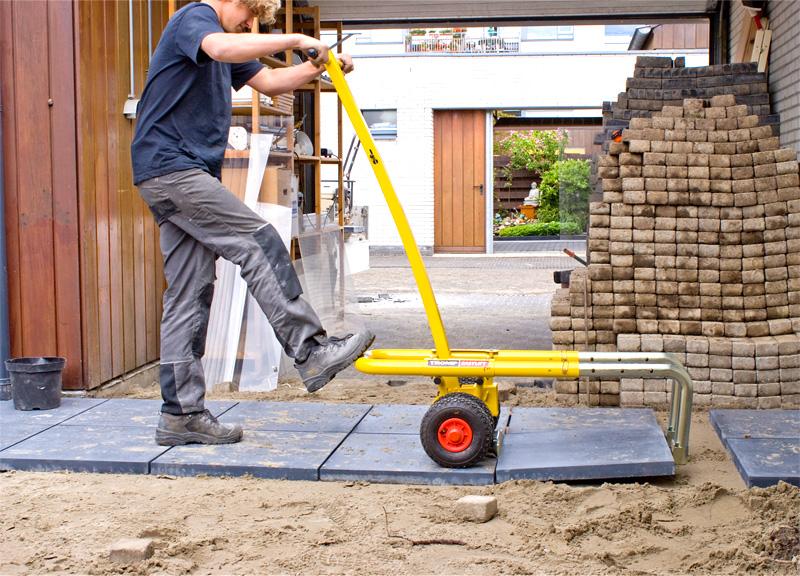 De Tromp EasyLift Pro tegels oprapen, transporteren en naadloos leggen en dat word dus een fluitje van een cent zou ik zeggen.
